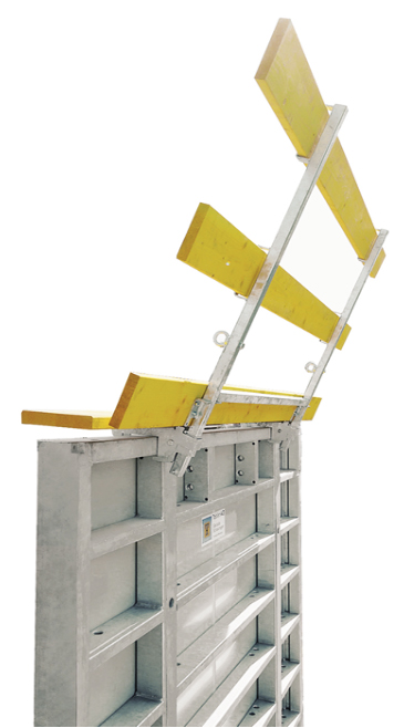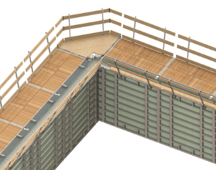 Unsere Eck- und Ausgleichsbühnen sind ebenso wie die Standard-Betonierbühnen mit Geländern ausgestattet, die über einen Einklappmechanismus verfügen.